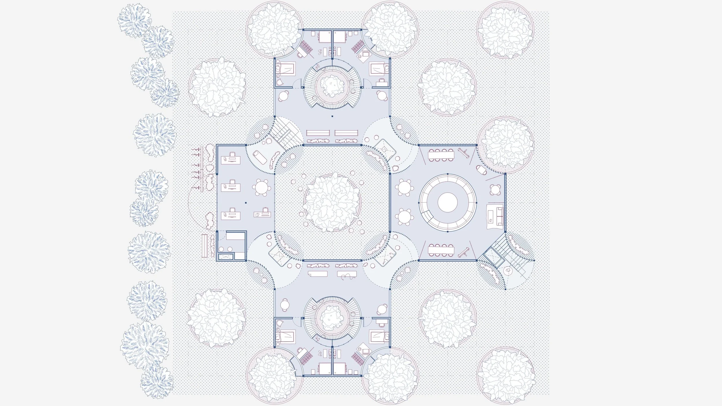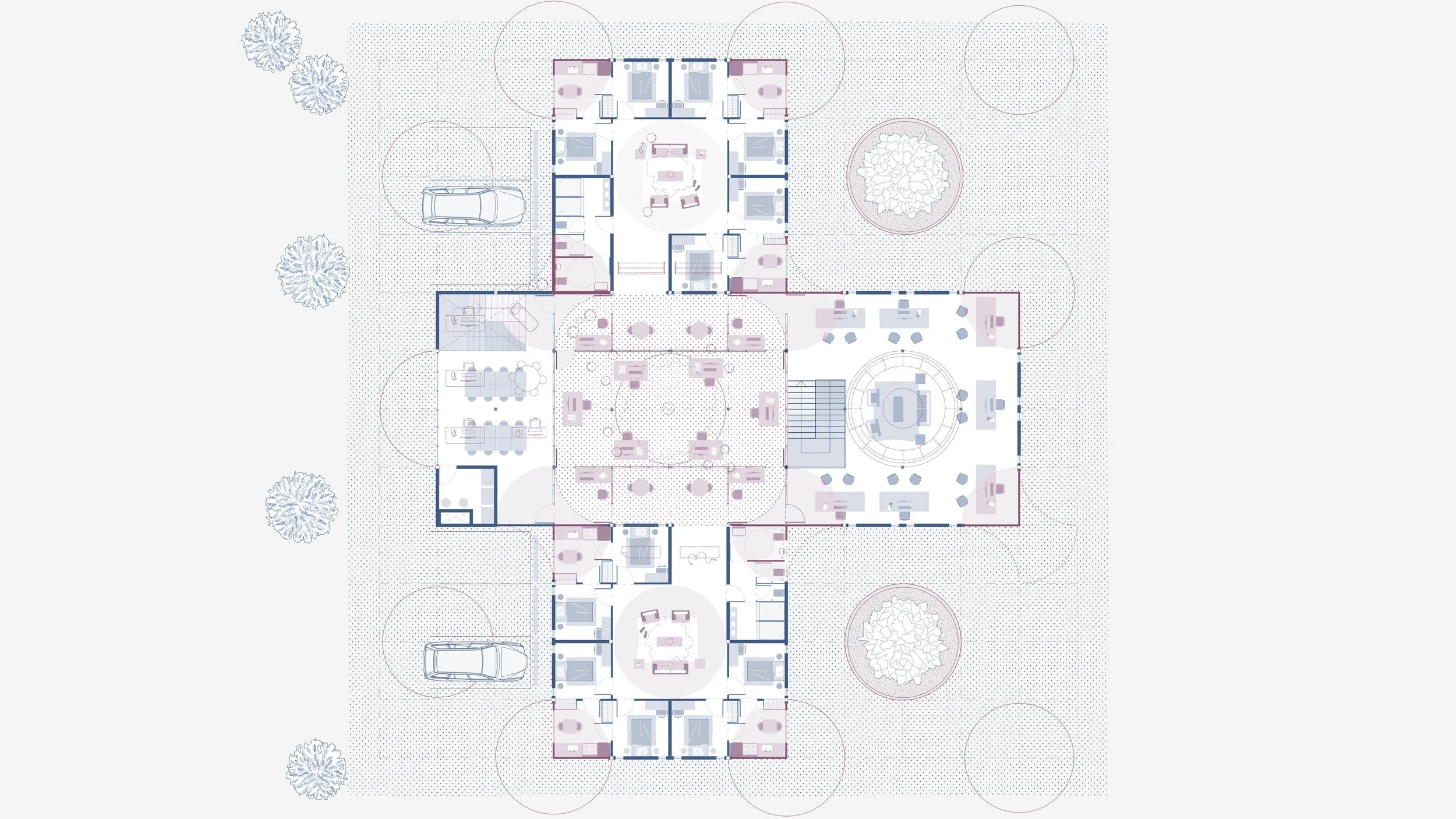 The voluntary rehabilitation facility consists of an aggregation of restorative justice blocks - a courtyard-based system that fosters community, accountability, and trust. This block's three essential parts are the restorative justice center, residential unit, and connective wellness core, producing a continuous loop.