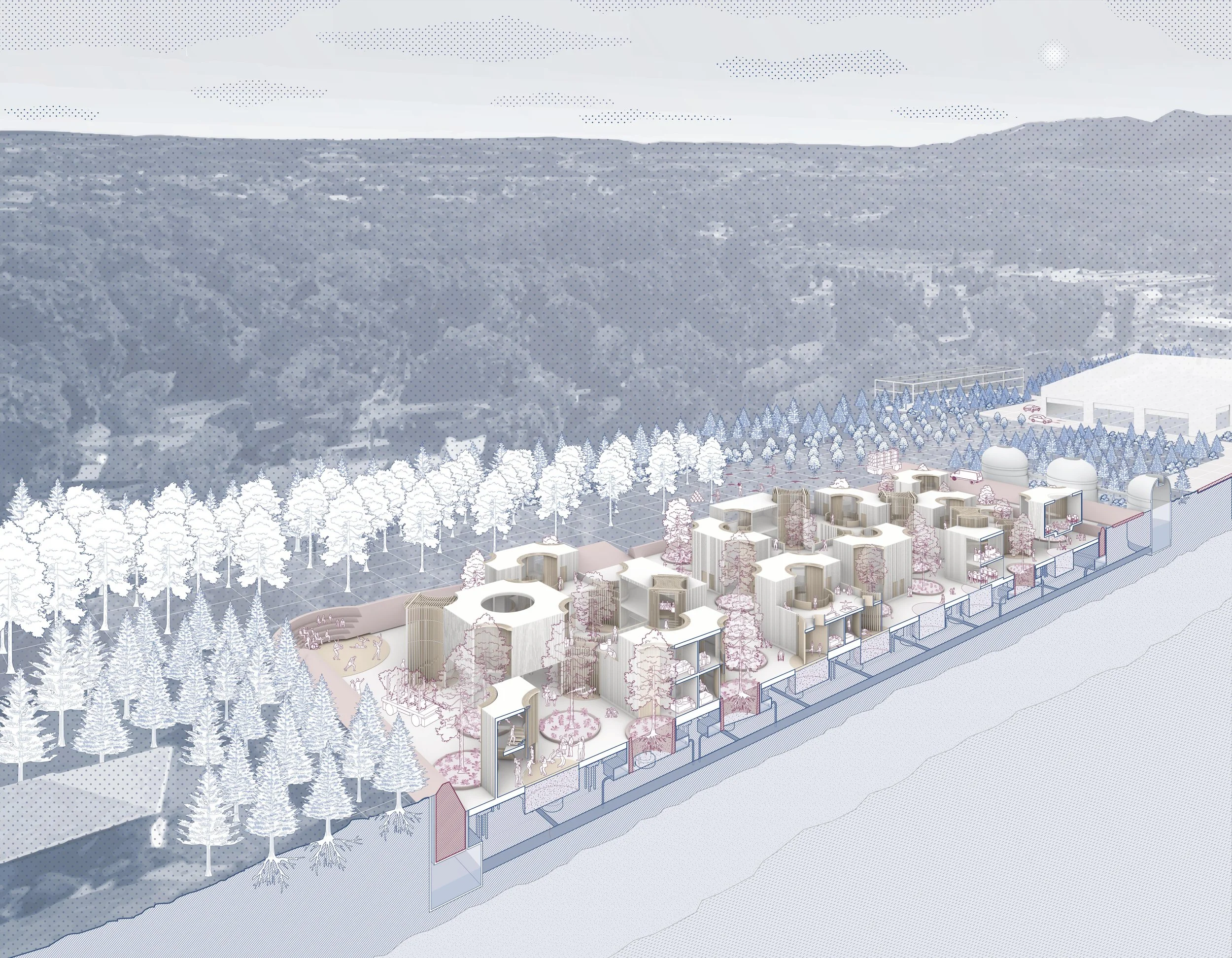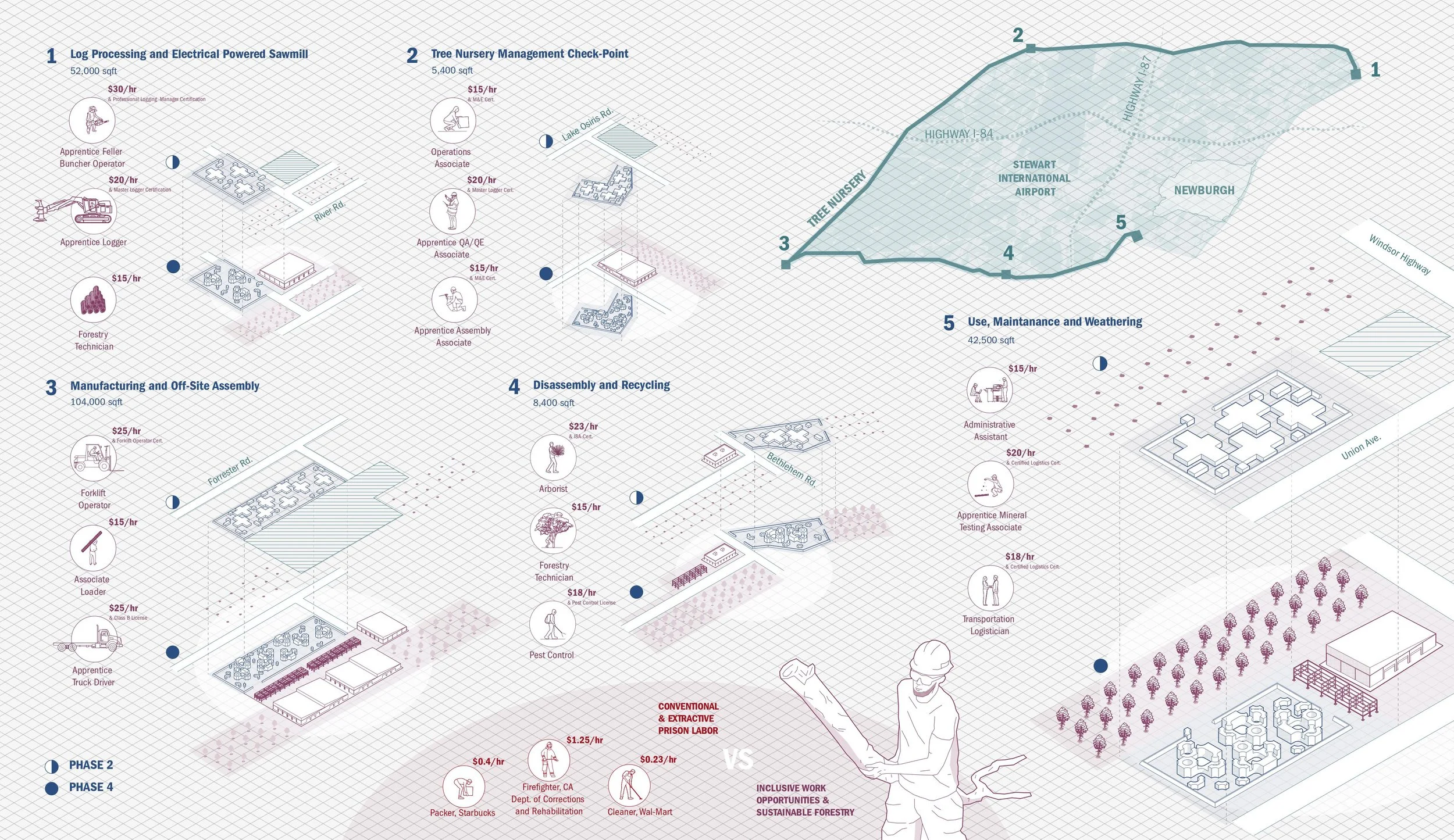 The tree nursery and substation network are the raw materials for the cross-laminated timber business. Its cyclical harvesting produces better climate regulation and sustainable construction materials, as well as learning and work opportunities. The harvesting and development rights of the corridor land are managed by a proposed public-private partnership between the Rehabilitation Network, CLT business, and a future High-Voltage Community Land Trust, ensuring democratic stewardship of (as-of-right) land use. In contrast to the conventional, extractive prison labor model, work opportunities - offered by the partnership to facility users and the community at large - are designed to be inclusive and career-oriented, with hourly salaries above minimum wage and prospects for professional certification.